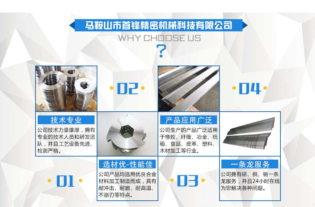 - 主打產品 : 剪板機刀片 圓刀片 折彎機模具 硬質合金(鎢鋼)刀片 分條機刀片 撕碎機刀片